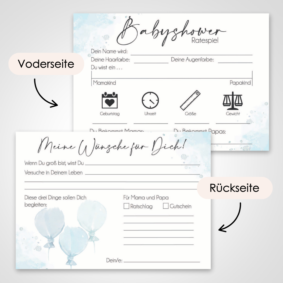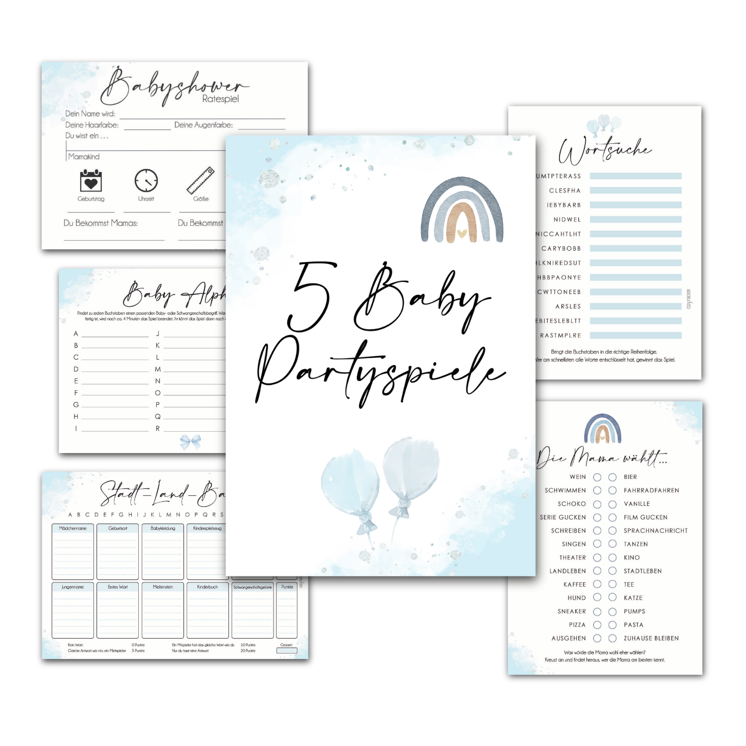 Blau | 5 Babyparty Spiele für 12 Spieler - Babyparty Geschenk, Karten zum Ausfüllen Partyspiele Babyshower