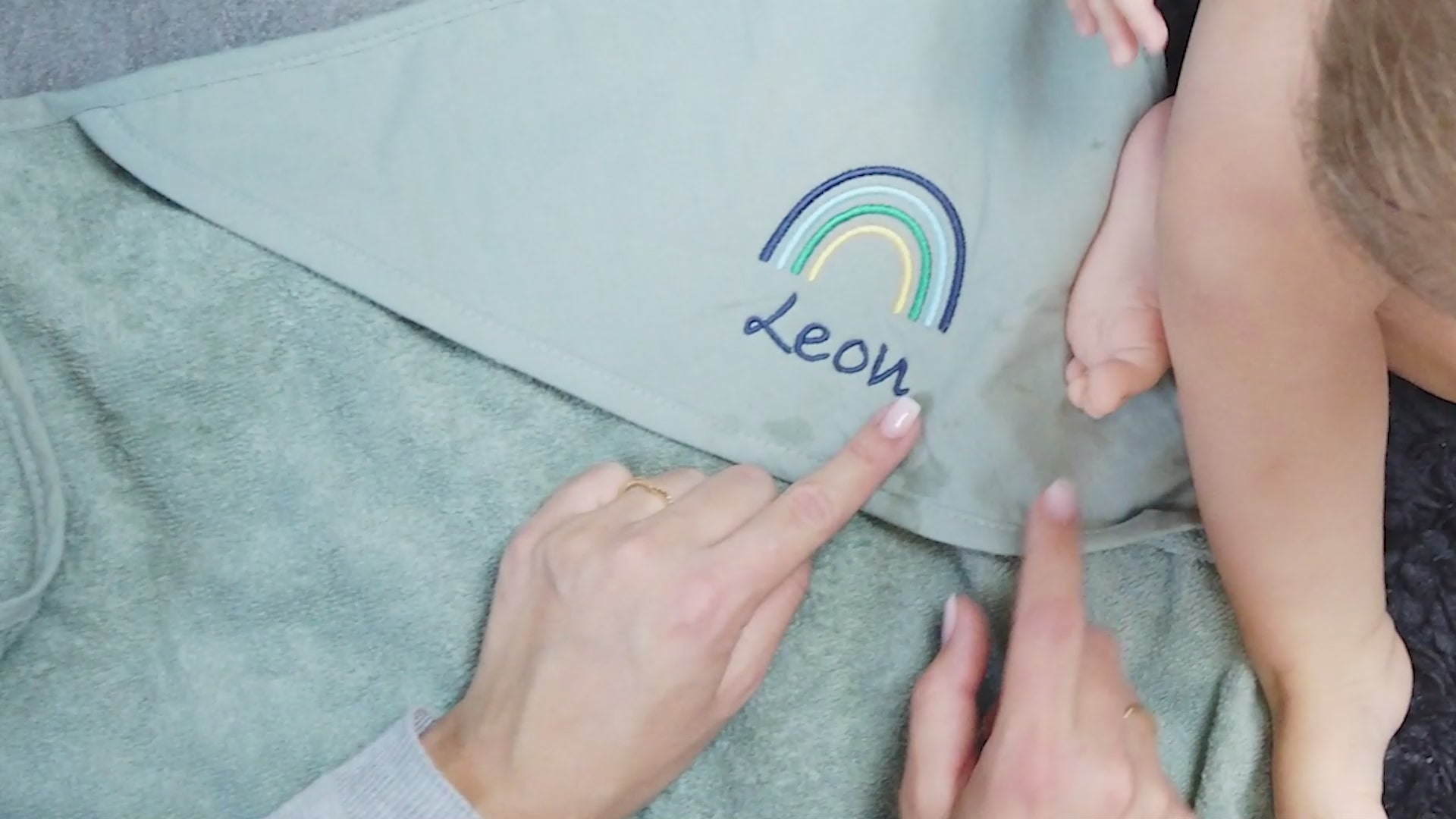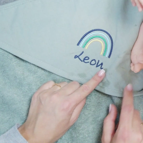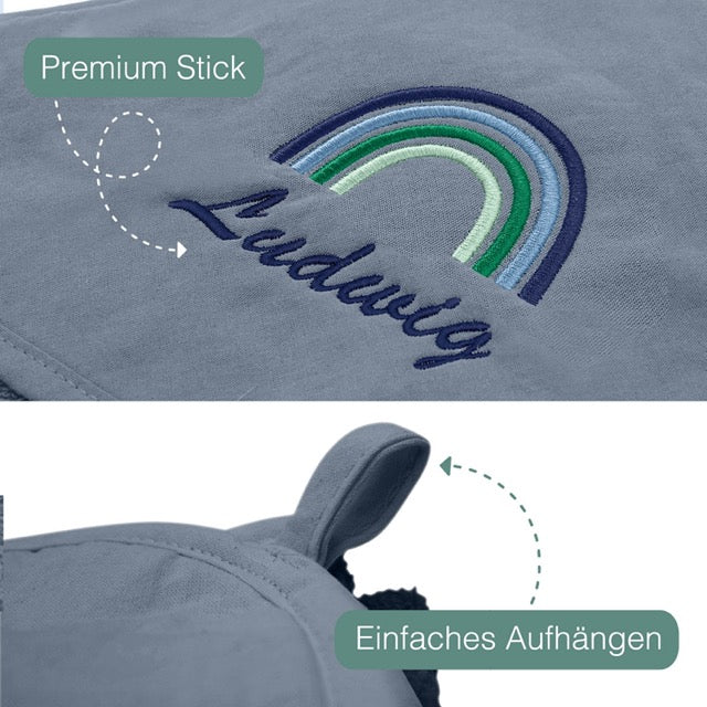 Das Badetuch wird von uns mit dem angegebenen Namen und nach Wunsch auch einem persönlichen Text bestickt. Erstelle ein persönliches Erinnerungsstück für dein Kind.