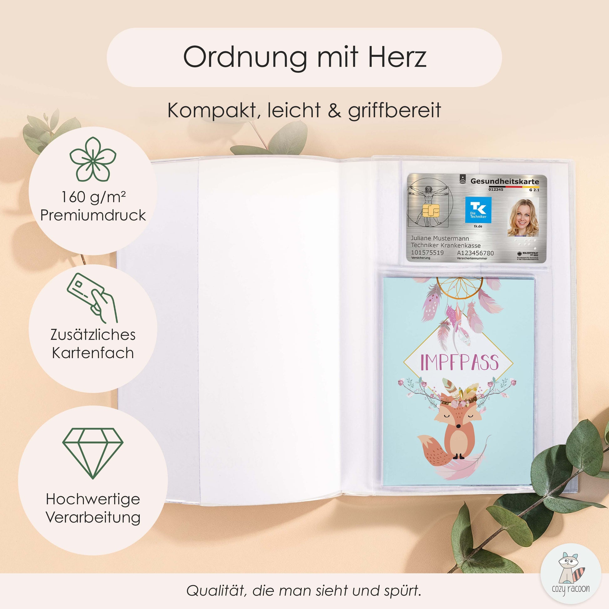 Unsere Hüllen werden in Deutschland produziert und sind besonders robust und langlebig. Wir drucken das Design auf professionelles 160g/m² Druckpapier und fassen es in eine passende Hülle ein. Das Cozy Racoon U-Heft- und Impfpasshüllen-Set ist mit viel Liebe zum Detail gestaltet. Das wunderschöne Design mit den Bären und Bäumen zaubert Dir bei jedem Arztbesuch ein Lächeln ins Gesicht