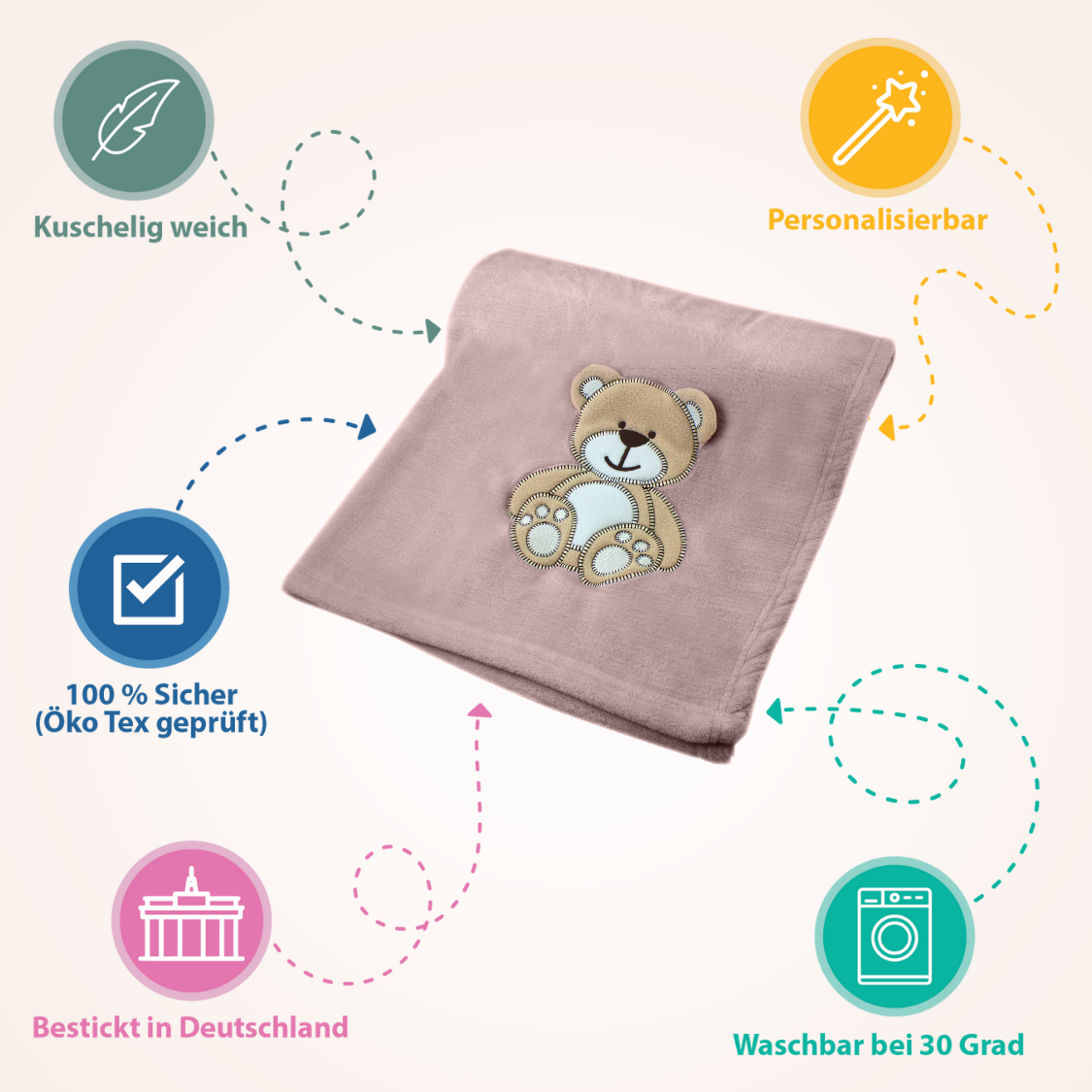 Decke Altrosa Mit Bär | Babydecke Bestickt mit Namen und Geburtsdatum