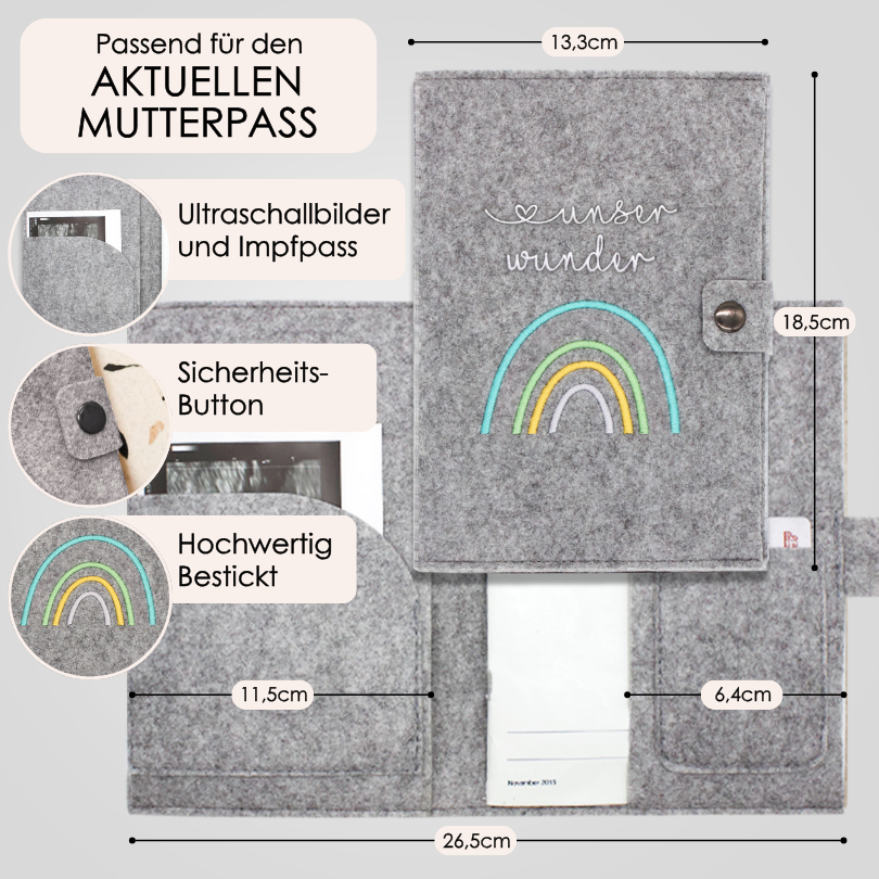 Unsere Schutzhülle ist angepasst an die Maße des aktuellen deutschen Mutterpasses mit den Maßen: 12,6 cm breit x 17,6 cm hoch . Bitte messe vor der Bestellung die Maße deines Mutterpasses nach, um sicherzugehen, dass unsere Hülle auf deinen Mutterpass passt