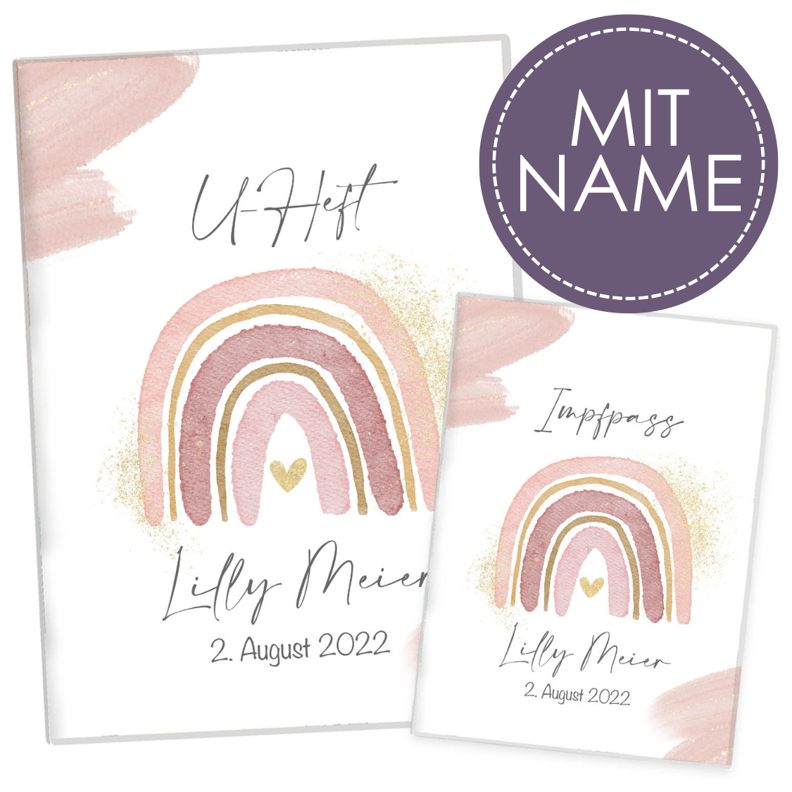 Die Beschriftung von U-Heft- und Impfpasshülle erfolgt auf der Vorderseite. Klicke einfach auf “Jetzt anpassen” und gebe deinen Wunschtext ein. Ob nur der Vorname, Vor- und Nachname & ob mit oder ohne Datum, du entscheidest was dir gefällt. Wir geben deinen Wunschtext vor dem Druck händisch ein und kontrollieren vor und nach der Herstellung ob dein Wunschtext schön angeordnet ist