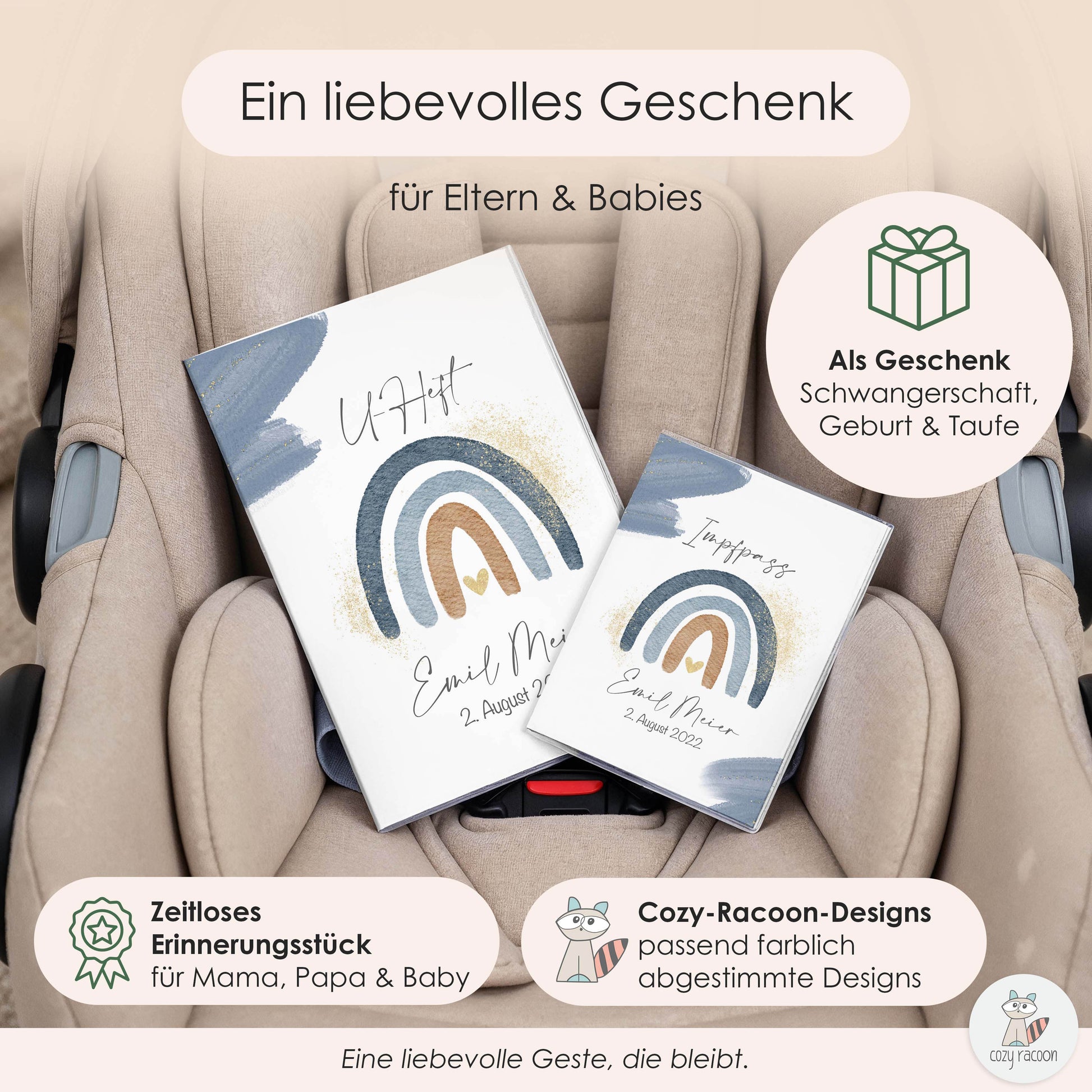 Unsere Hüllen werden in Deutschland produziert und sind besonders robust und langlebig. Wir drucken das Design auf professionelles 160g/m² Druckpapier und fassen es in eine passende Hülle ein. Das Cozy Racoon U-Heft- und Impfpasshüllen-Set ist mit viel Liebe zum Detail gestaltet. Das wunderschöne Design mit den Bären und Bäumen zaubert Dir bei jedem Arztbesuch ein Lächeln ins Gesicht