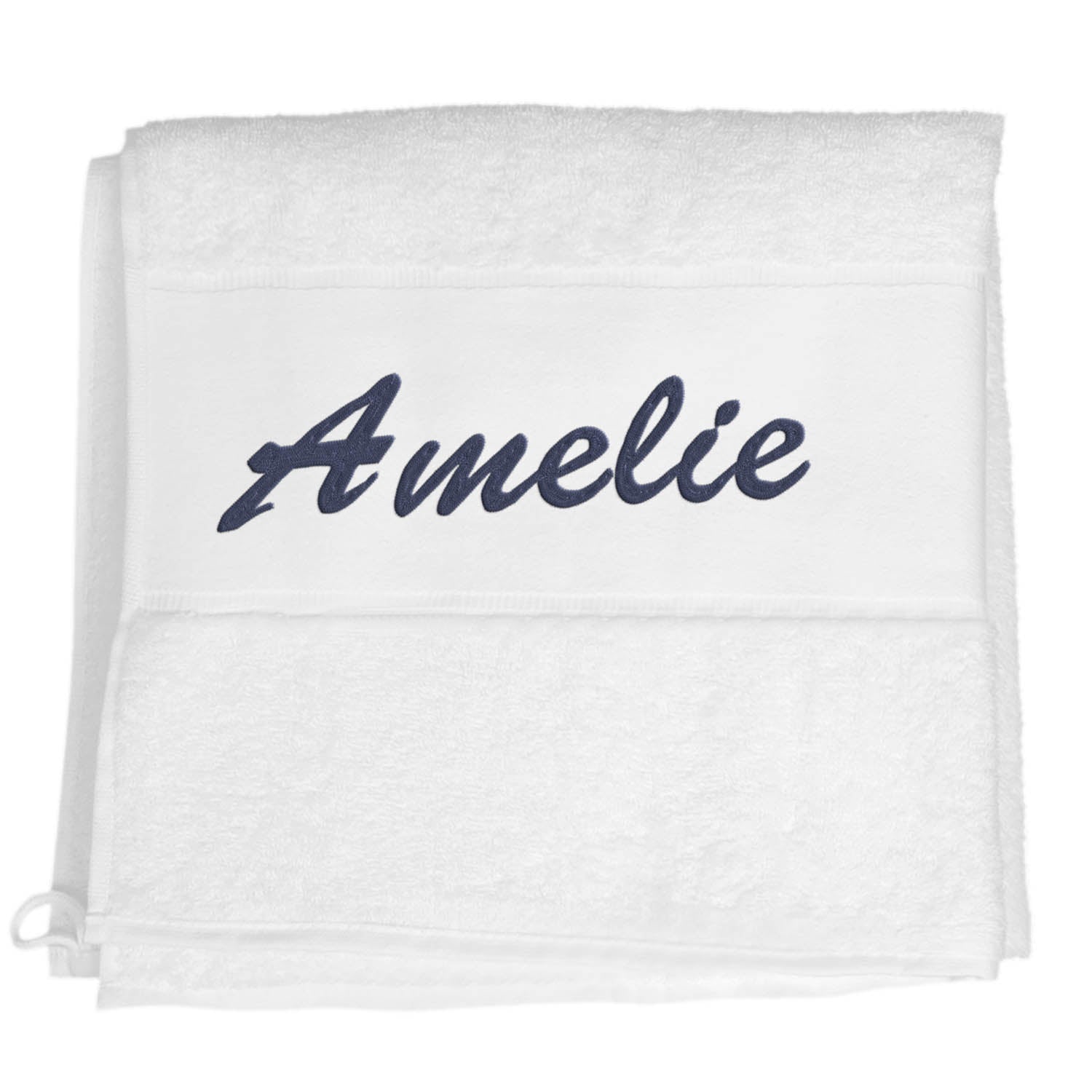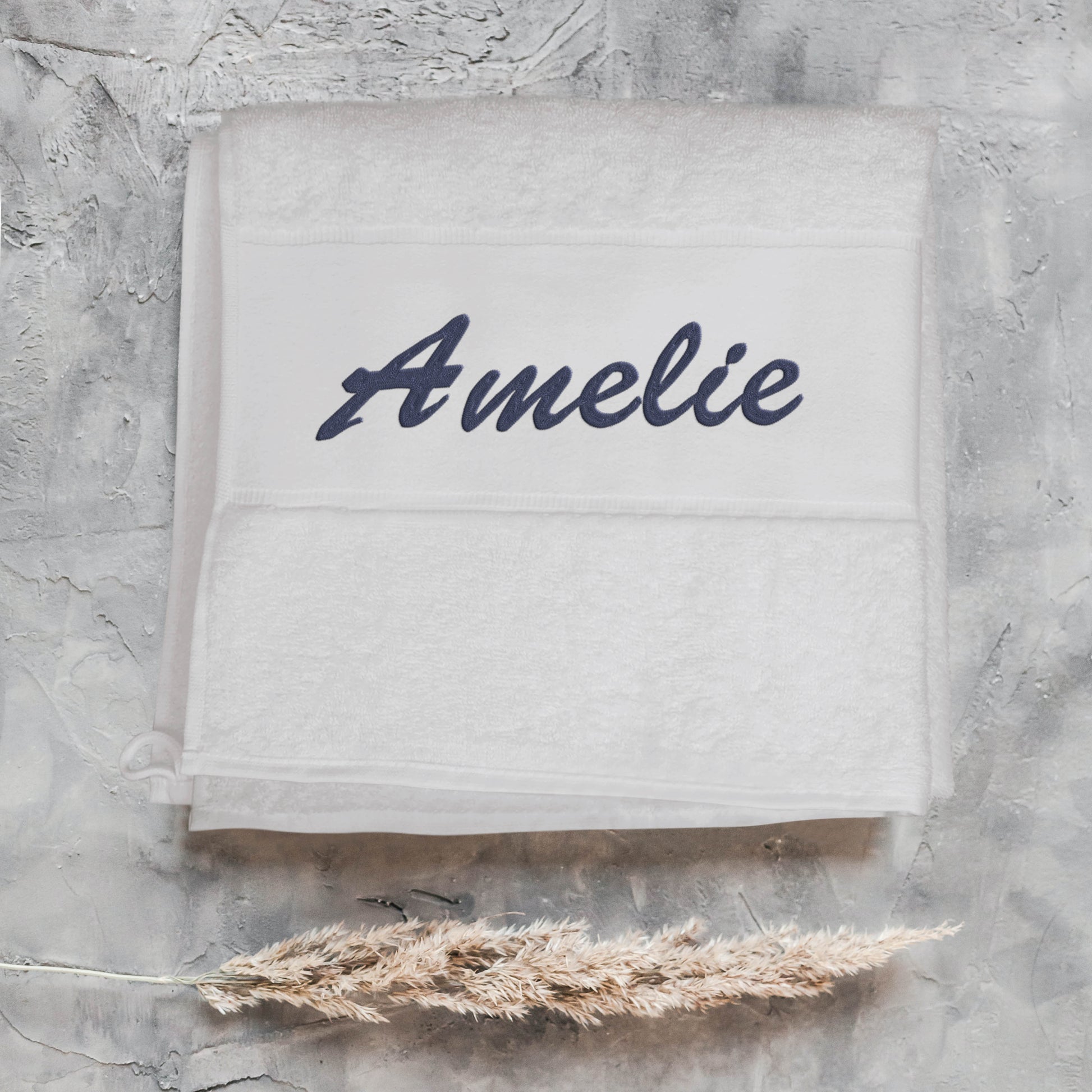 Das Handtuch wird von uns mit dem angegebenen Namen und nach Wunsch auch einem persönlichen Text bestickt. Erstelle ein persönliches Erinnerungsstück aus 10 verschiedenen Schriftarten und 16 verschiedenen Garnfarben