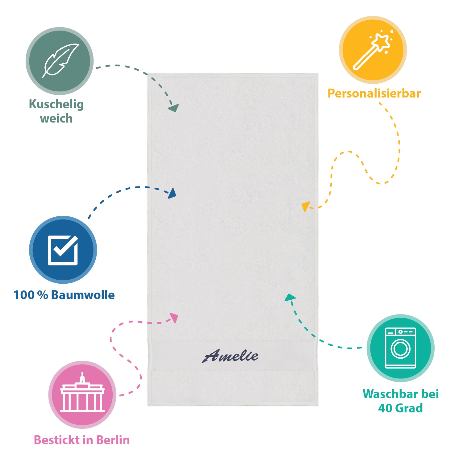 Unsere personalisierten Handtücher eignen sich ideal als einzigartiges Geschenk für jeden Anlass. Ob zum Geburtstag, zur Hochzeit oder zu Weihnachten. Mache deinen Liebsten eine Freude mit einem kuschelig weichen Unikat.